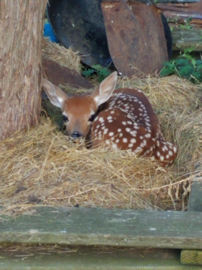 어미 사슴이 급했는지 새끼를 사람 사는 곳에 겁도 없이 놔 놓은 것이다. 동생이 잔디를 깎고 남은 풀을 나무 밑에 부어 놓았는데 그 풀 이불 위에 편안히 엎어져 있다. 사진을 찍기 위해 아기 사슴 곁으로 다가가도 아기 사슴은 위협을 못 느끼는지 가만히 있다.