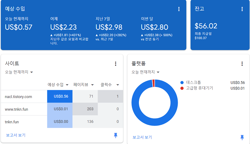 옷수선으로 먹고사는 나는 부업으로 티스토리 블로그로 영어공부 컨텐츠와 직접 쓴 문학 창작글을 올리고 있다. 그리고 몇 년 전 부터 시작한 테네시 커뮤니티 웹사이트도 운영하고 있다. 작년 2022년엔 블로그 애드센스 수익이 아주 형편 없었다. 하루에 평균 5센트? 그리고 웹사이트 애드센스 수익은 하루 평균 40센트? 그런데 올해 2023년 들어 블로그가 훨씬 돈이 되는 모양새를 보인다.