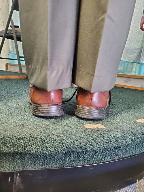 대개 다리 길이가 다를 수 있어서 입어 보라고 했다. 그런데 땅에서 부터 길이가 양쪽 다 같다. 하지만 그는 앞에 구겨진 부위가 살짝 다르다며 생때를 쓰기 시작한다. 이미 그는 기장에 차이가 난다는 고정관념 때문에 아무리 사진을 찍어서 보여줘도 받아들이질 않는 모양이다.