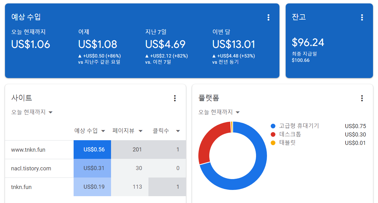 사실 하루 1달러 수익을 창출하기 위해 근 5년간 들인 노력을 생각하면 자동수익이 아니라 노가다다. 하지만 즐거운 노가다이니 그동안 할 수 있었다. 그리고 언젠가는 더 큰 결실을 볼 것이란 기대에 동기가 생긴 것이다.