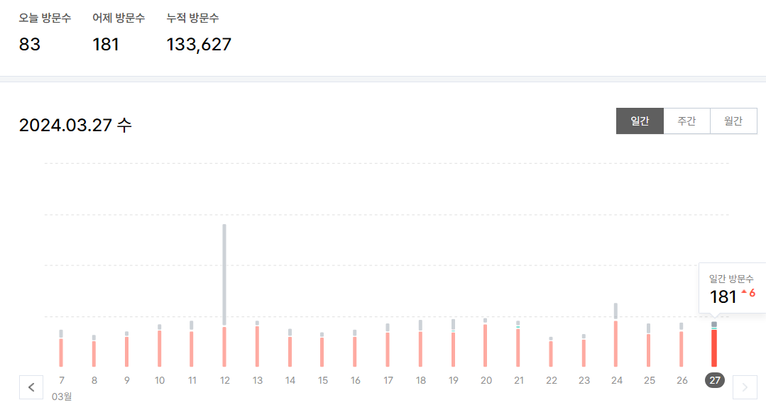 위 그래프는 티스토리 블로그의 일간 방문자이다. 보시다시피 하루 평균 200명이 될까말까. 1년 전 60명이던 때에 비하면 많이 증가했다고 본다. 내 블로그는 영어공부 콘텐츠가 많고 직접 쓴 시, 수필등의 문학과 챗 지피티의 도움을 받은 정보글이 주를 이룬다. 현재 나는 어머니와 미국에서 옷수선으로 생계를 유지하고 있다. 80세 이신 노모를 너무 고생시켜 드리는 거 같아 이래저래 옷수선을 벗어나도 살 수 있는 길을 찾고 있다.